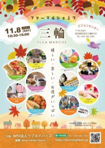 2025年11月8日(土)『フリーマルシェ三輪』開催決定 投稿日: 10月 28, 2025 投稿者: 林友子 チャリティイベントのお知らせです🌎💕 是非遊びに来てください🌟マルシェのキッチンボランティア、フリーマーケットの出店者も募集中です👗応募は下記の問い合わせ先よりお願い致します。 売上の一部と寄付金は子ども食堂『みんなdeごはん』に係る支援金となります😌 日時:2025年11月8日(土)午前10:30〜15:00 場所:Jesus Family Church ビジョンセンター 東京都町田市三輪町392 問い合わせ先:044ー385ー2964 林友子